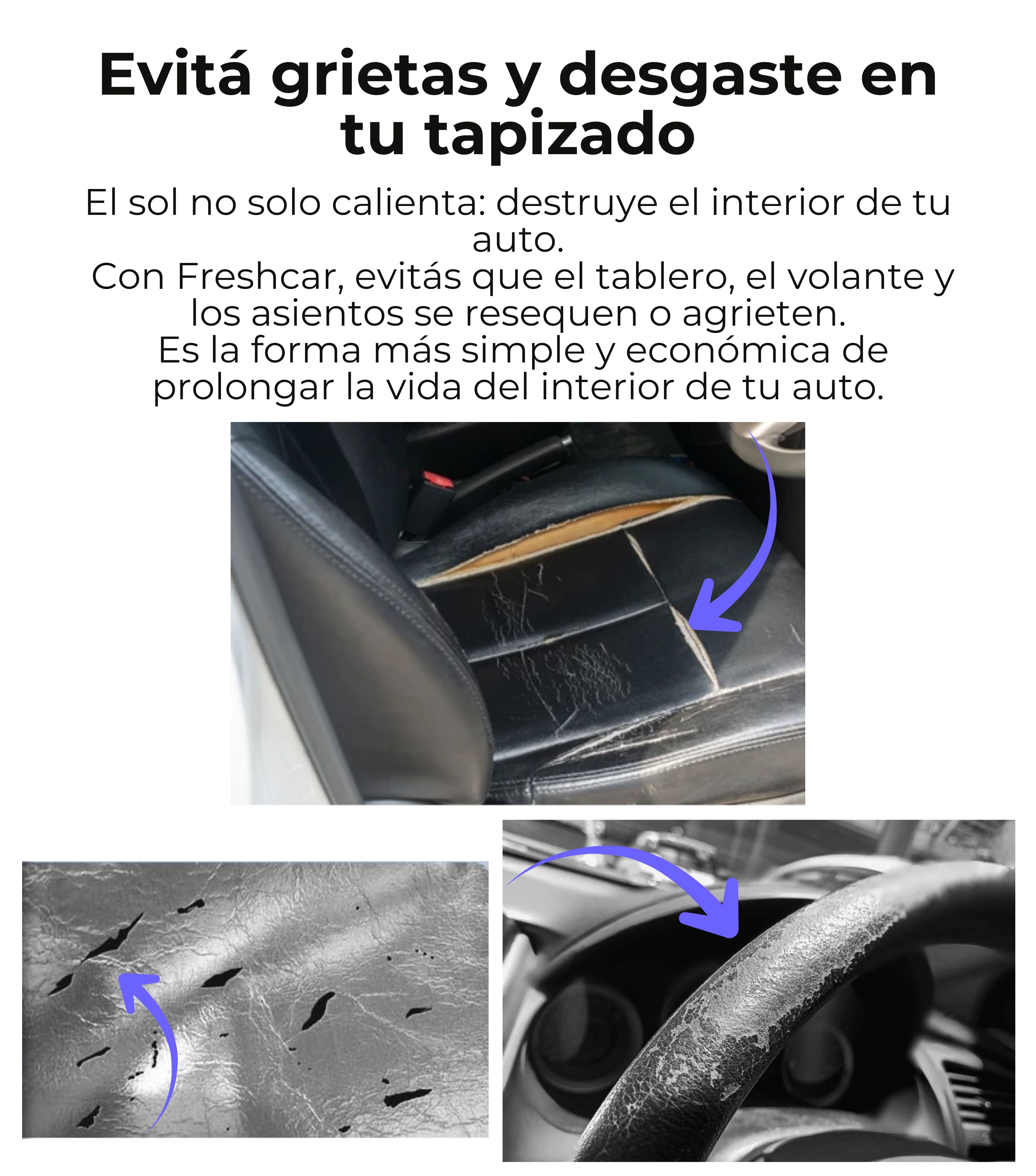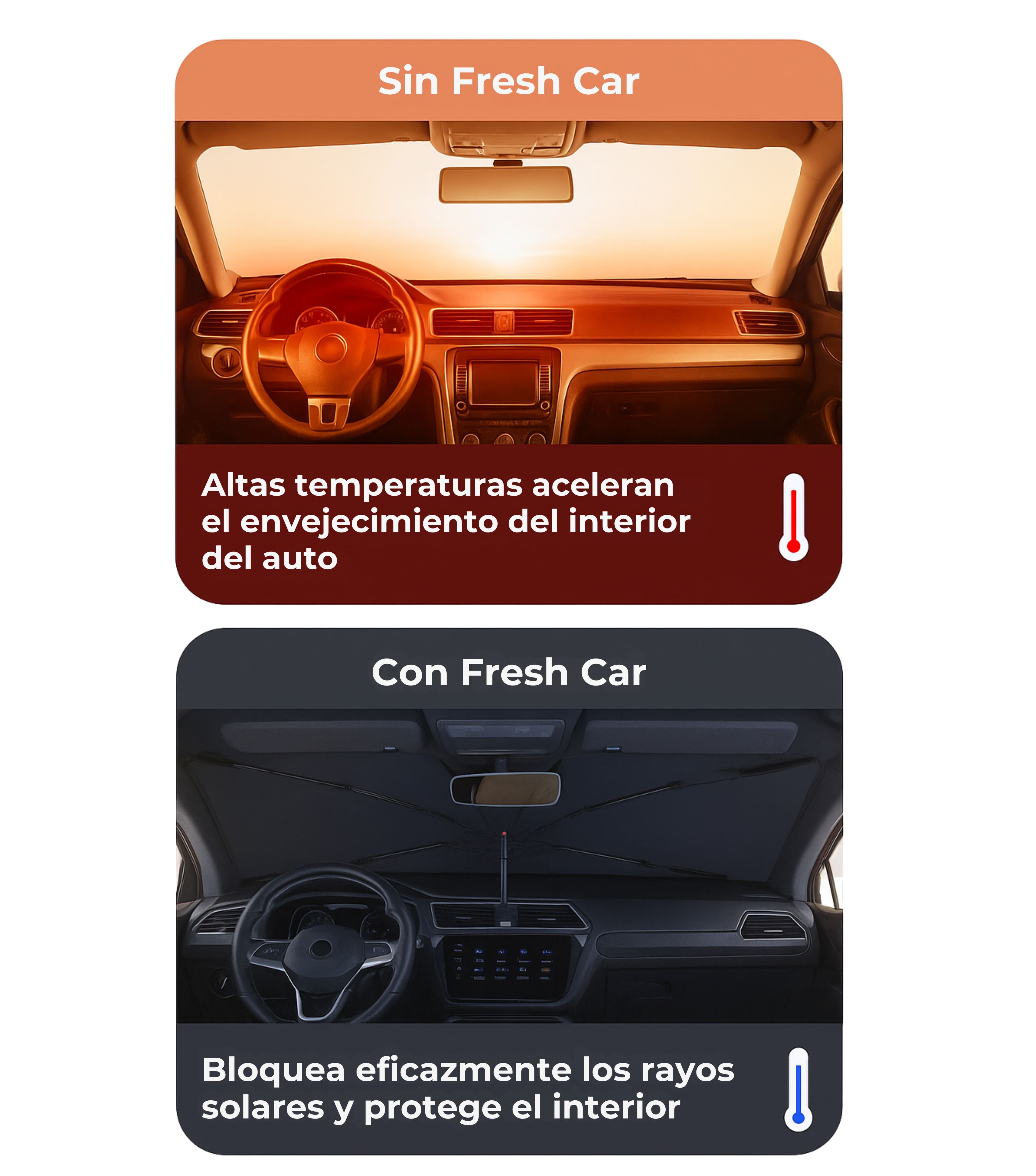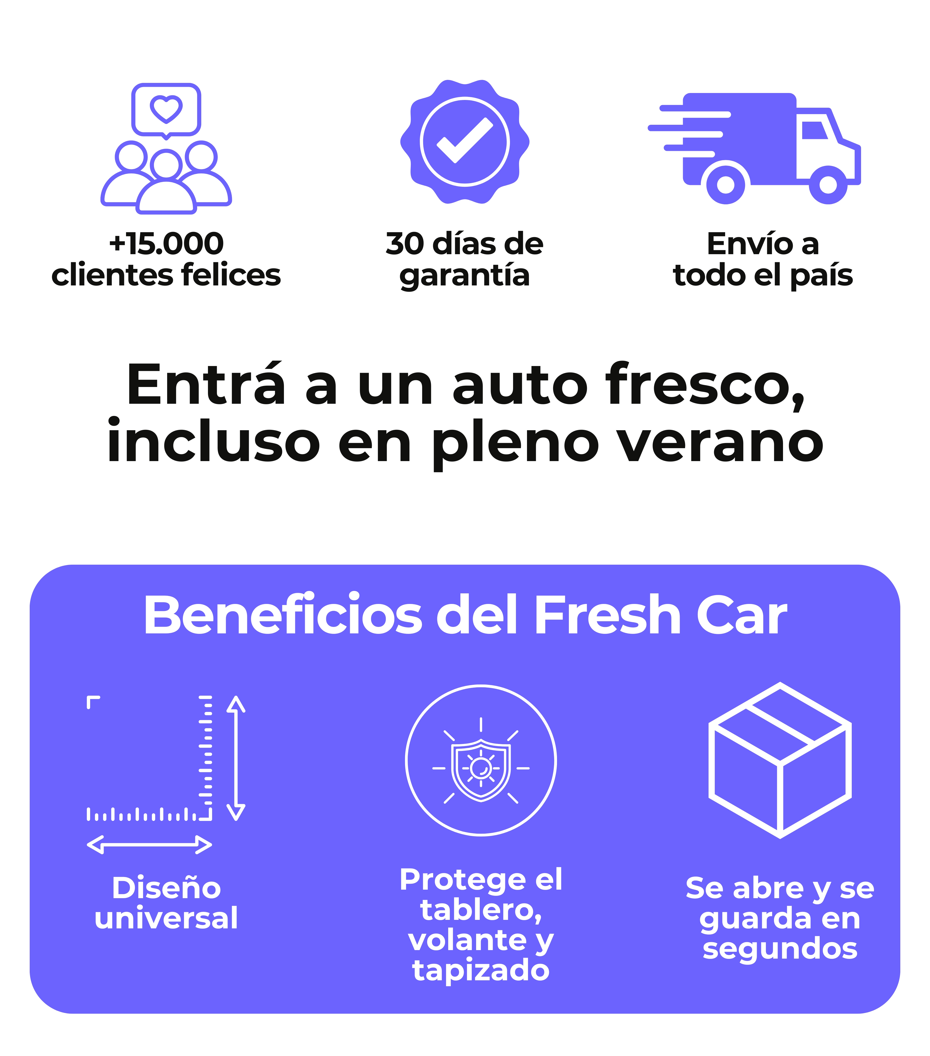 Freshcar refleja hasta el 90% del calor y mantiene el interior del auto hasta 20° más fresco. En segundos, pasás de un “auto sauna” a un espacio cómodo y respirable, sin esperar al aire acondicionado.